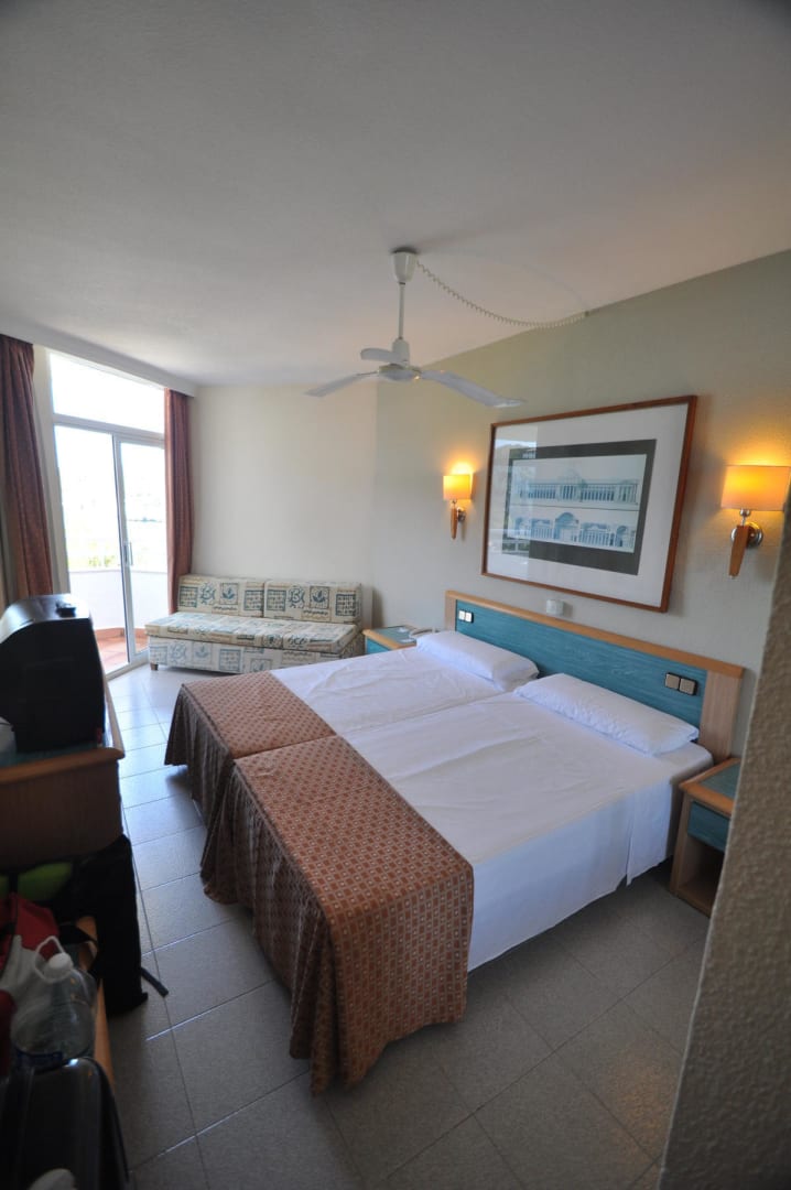 Zimmer mit AufbettungDoppelbett, dahinter das fast schon hässliche Ausziehsofa, links der Röhren-TV, oben der Ventilator.