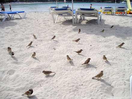 Die Sperlinge sind in Scharen am Strand anzutreffen, stören aber nicht. Wenn ein paar Brotkrümel in den Sand fliegen hat man sofort einen Schwarm um sich herum.