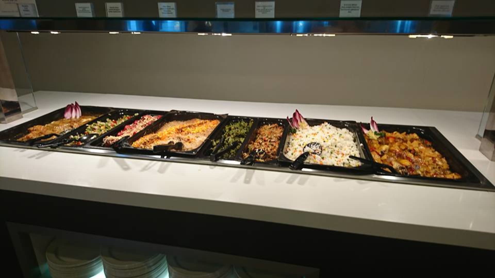 Restaurantdas und gegrilltes Fleich oder Fisch wurde angeboten an warmen Speisen