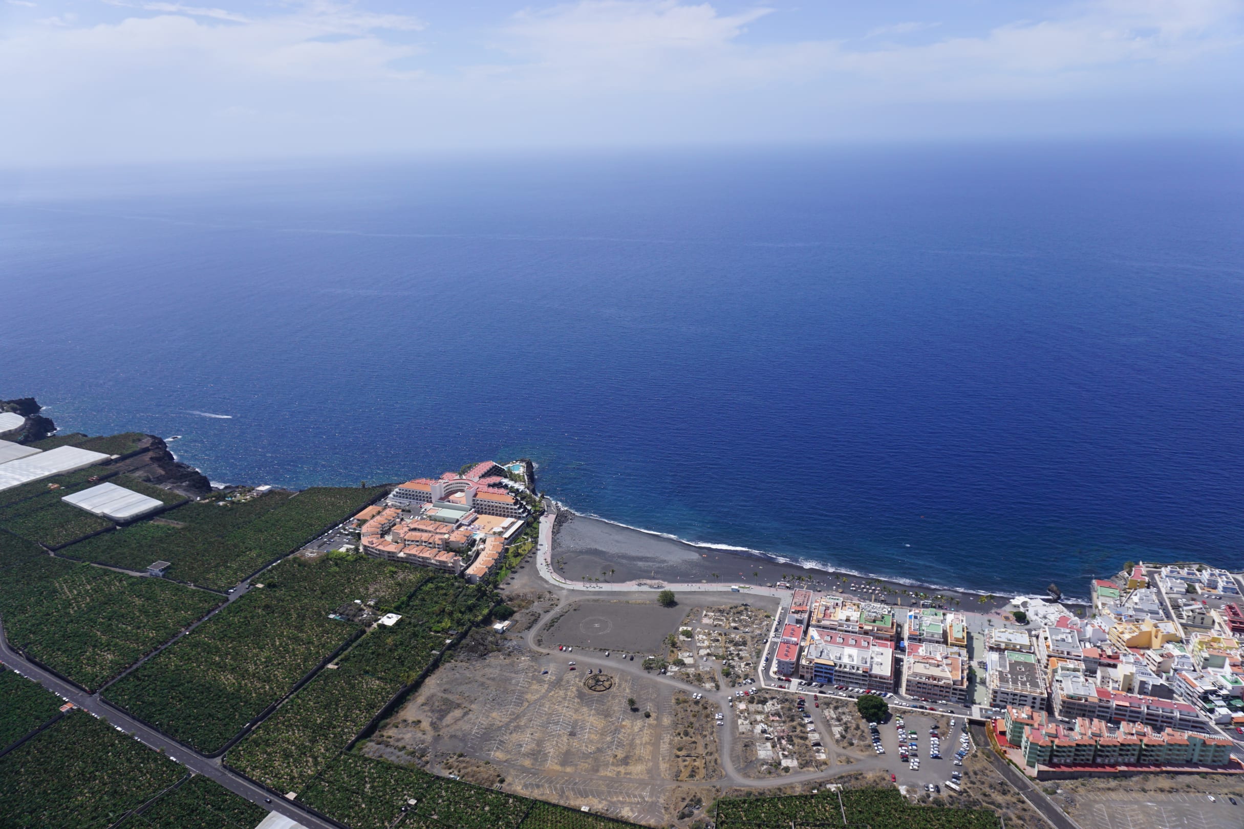 Ebenfalls Ansicht von oben beim Paragliden: man sieht die Hotel-und Apartmentanlage auf der Lavazunge liegen und rechts Puero Naos und die Meeresbucht. Die Entfernung von Hotel und Ort sieht weiter aus ,als sie ist...nur ca. 2 Min.