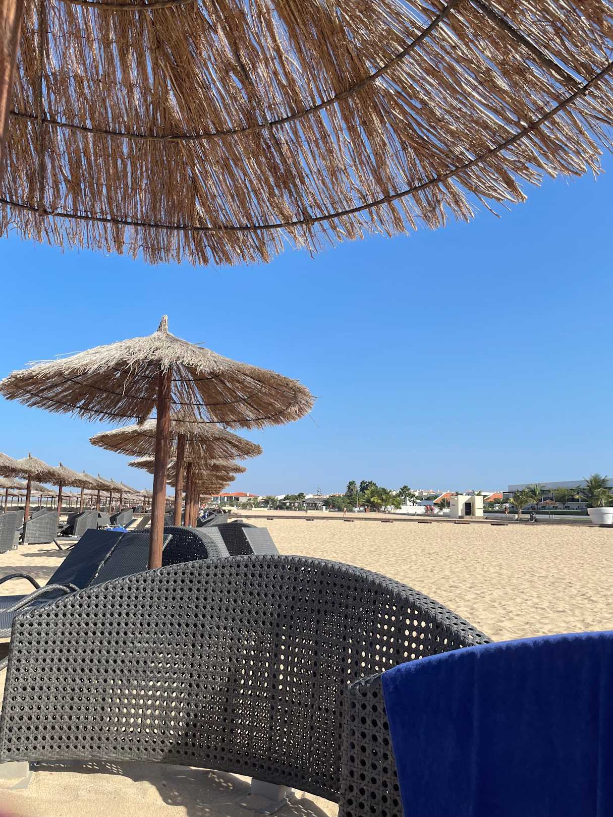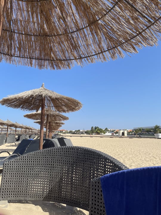 StrandAm Strand sind die Liegen ohne Auflage aber mit Windschutz.