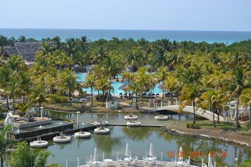 Gartenanlage mit Lagune und PoolIm Vordergrund die Lagune, dahinter etwas versteckt der Pool. Nach dem "Wäldchen" das Meer.