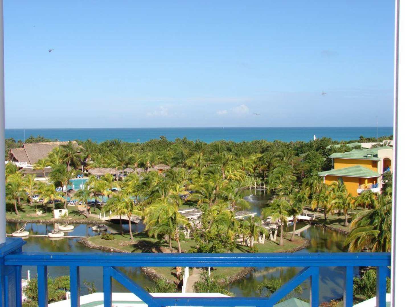 Blick vom Balkon auf das Hotelgelände Pool und Mehr