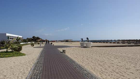 Strandweg rechts geht es zu den Liegen, links das Gebäude gehört zum Schwesterhotel