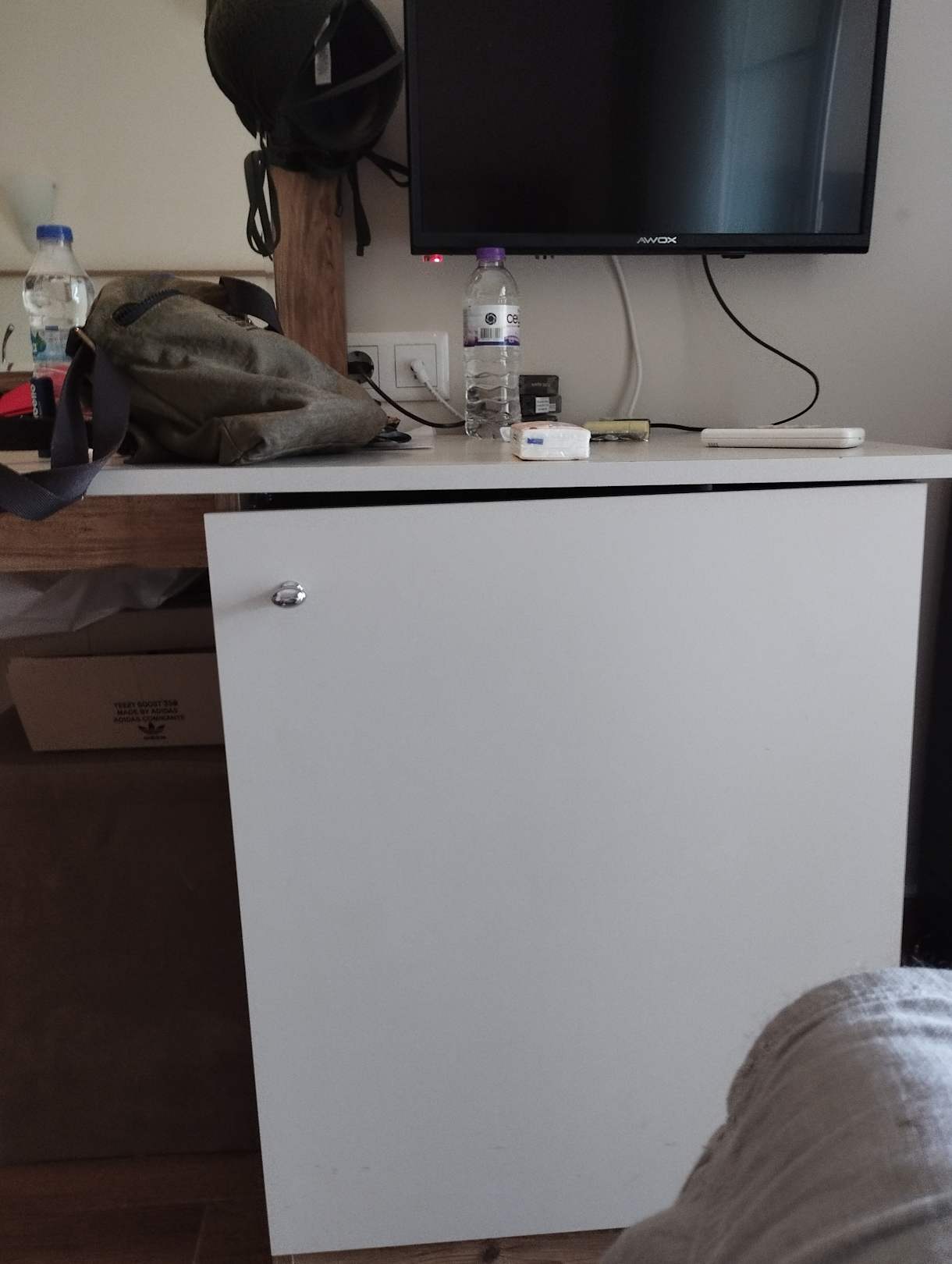 Dahinter ist der Kühlschrank, die Möbel haben ihre Jahre alle hinter sich .