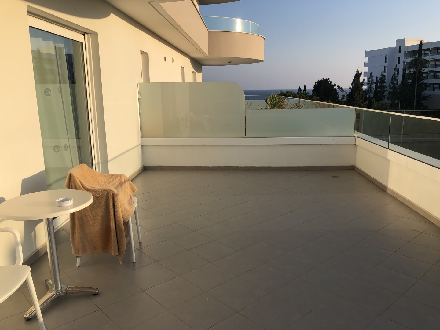 ZimmerTerrasse mit seitlichem Meerblick (leider war das Meer nur im Stehen zu sehen). Auf der anderen Seite war die Straße