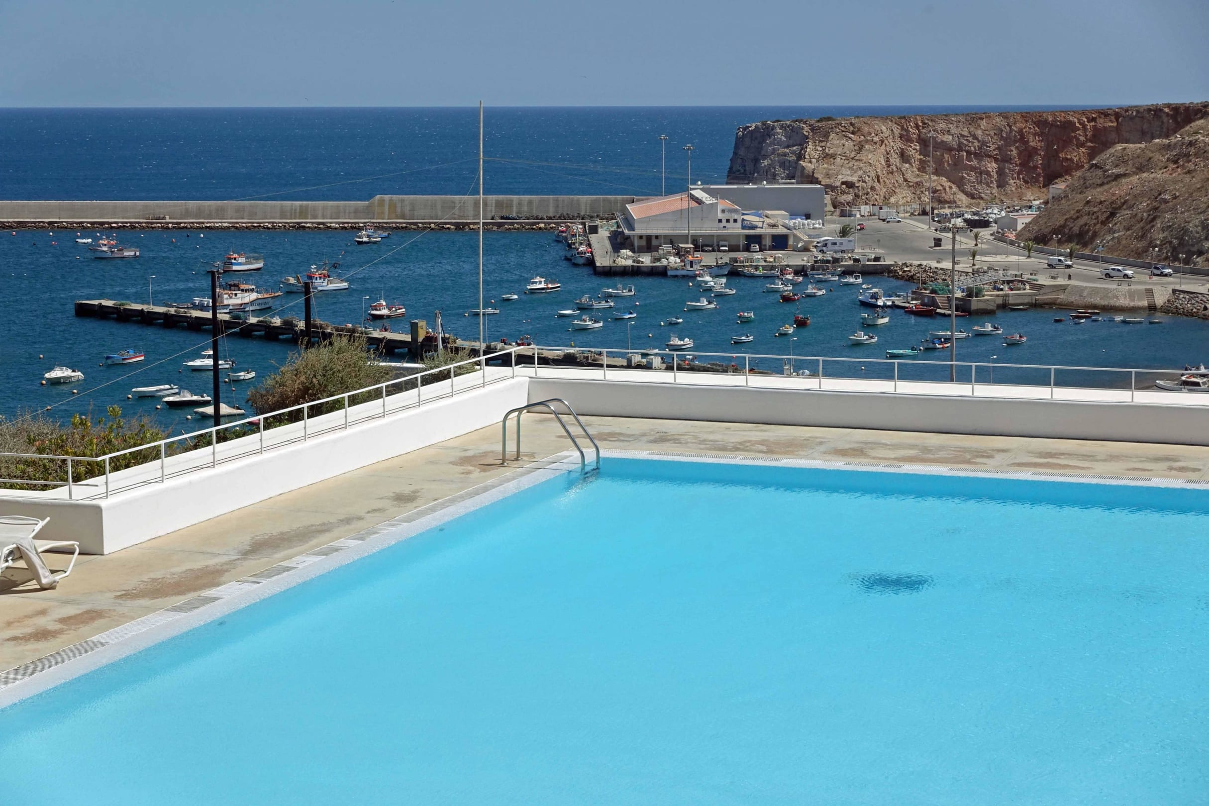 Blick über den Pool auf den Fischereihafen