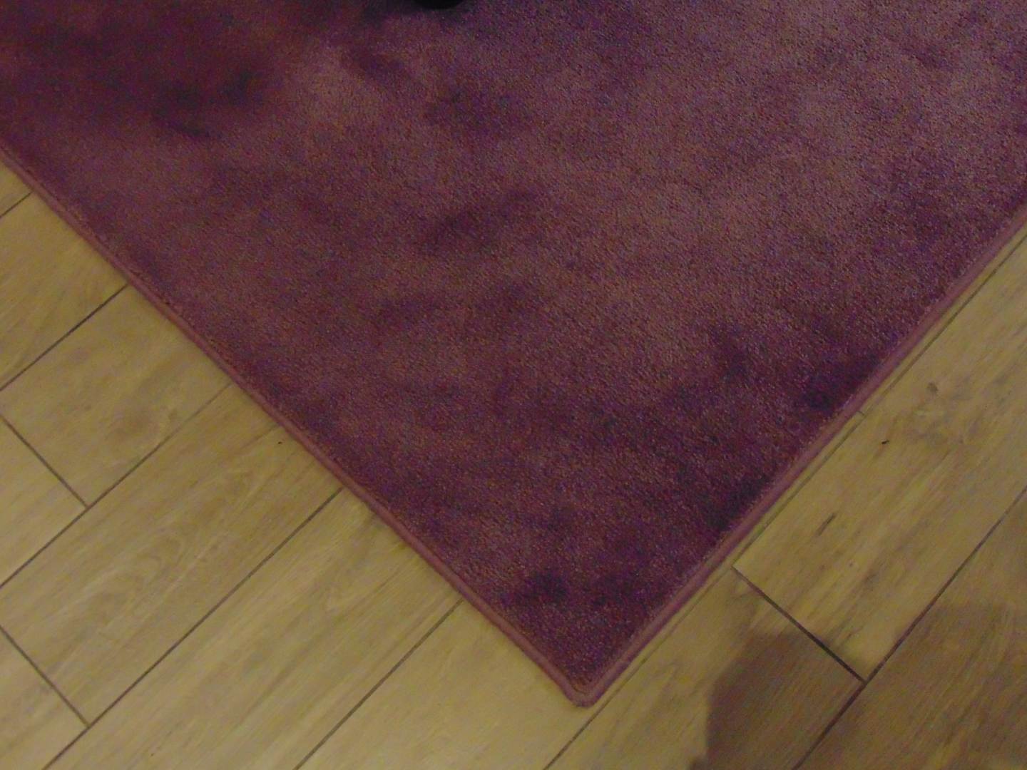 Brombeerfarbener Teppichboden unter dem Bett.