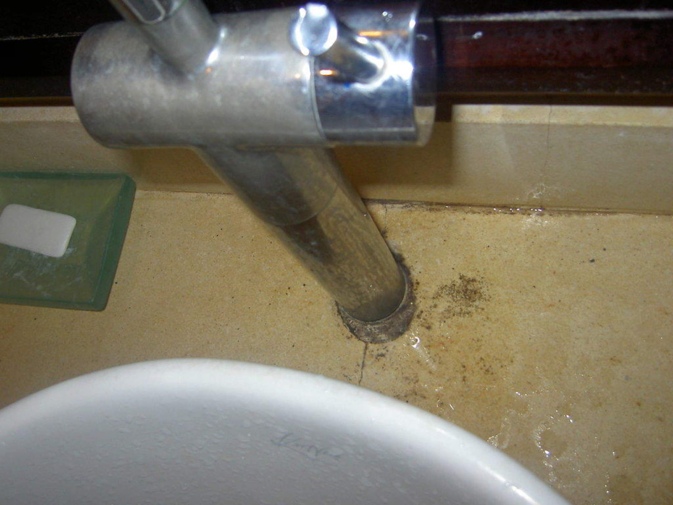 Das Bad. Gestylter Wasserhahn aber versifft