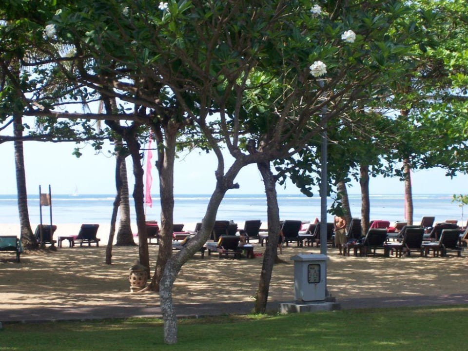 Hotelstranddie Liegen stehen unter den Bäumen gut im Schatten, könne aber auch jederzeit auf den breiten Sandstrand in die Sonne gezogen werden.