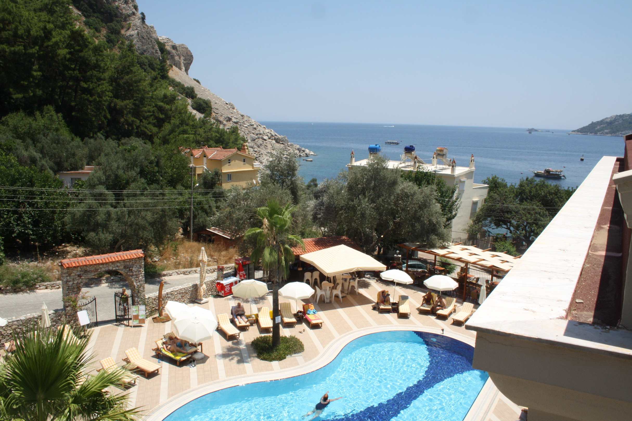 Ausblick vom Balkon auf den Pool und das Meer