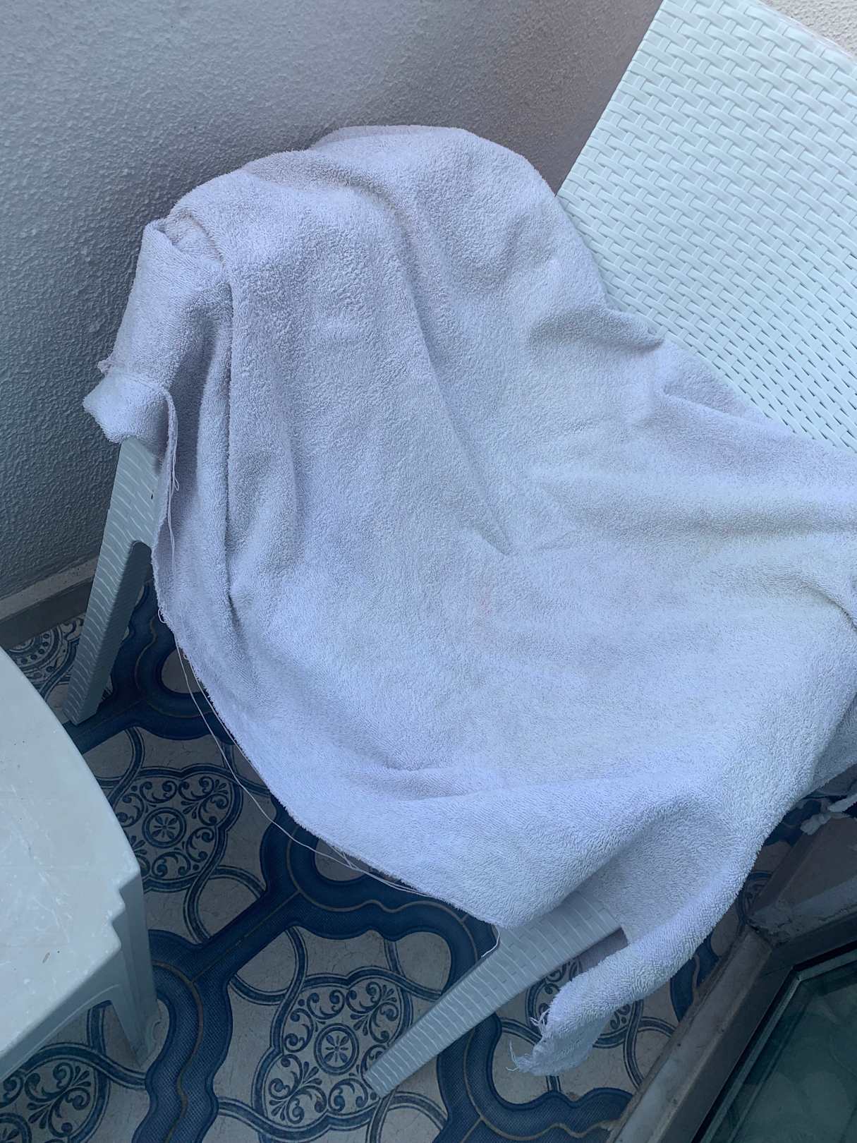 So sah unser Pool Handtuch aus . Löcher , Flecken aber frisch gewaschen das roch man . Die sollte man entsorgen und für bessere sorgen . Das war echt sehr grauenhaft