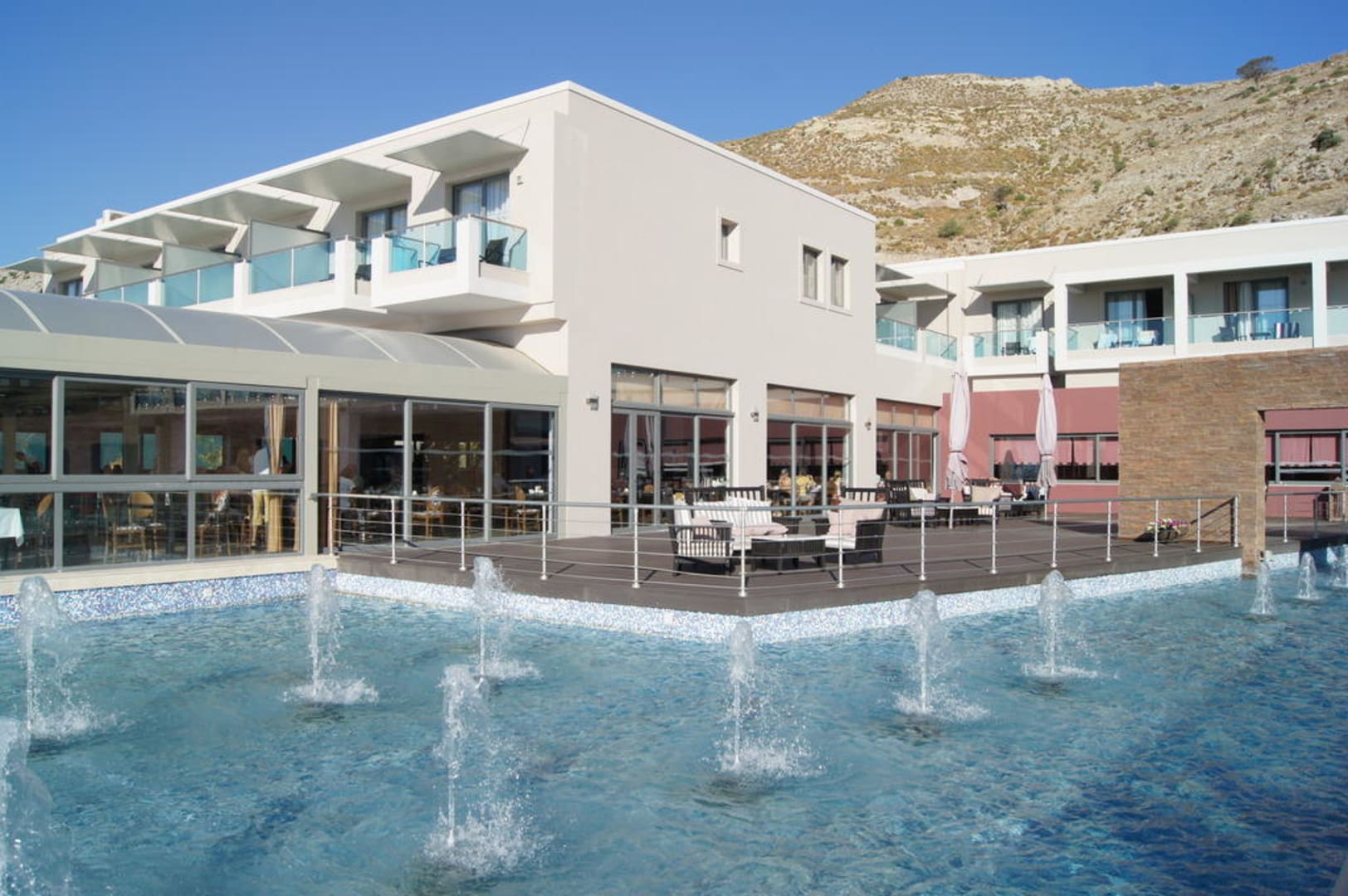 Blick auf Restaurant und Holzterrasse
