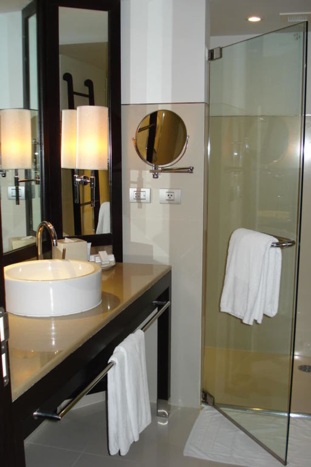 Waschbecken links, Dusche rechts. Rechts neben der Dusche gibt es noch eine separate Badewanne.