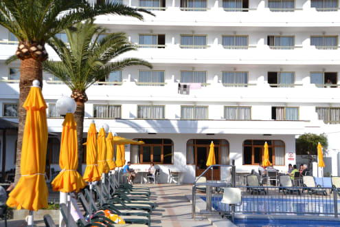 Blick vom Pool zu den Zimmern