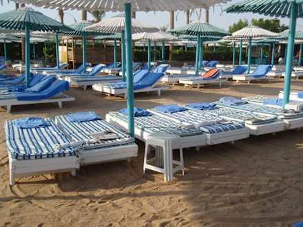 reservierte Liegen am StrandSo sah es aus, wenn man dem Beachboy Trinkgeld gegeben hat. Dort, wo die Handtücher nur hingelegt sind, war noch niemand. Zum Teil schon am Vorabend wurden T-Shirt oder Zeitschriften befestigt (siehe vorn), damit der Boy weiß, wo die Handtücher hin sollen. Wo Handtücher ausgebreitet sind, da waren schon Gäste.