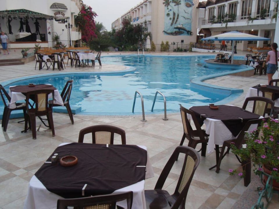 Pool am AbendZum Abend wurden die Liegen weggeräumt und Tische für das Abendessen hingestellt, damit man auch draußen sitzen konnte.