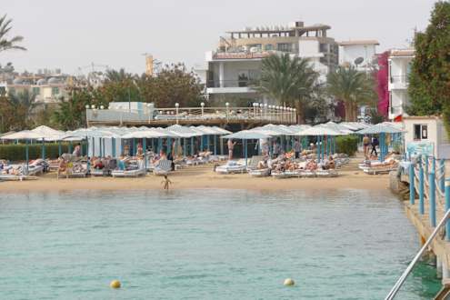 Strandblick vom steg auf hotel und strand