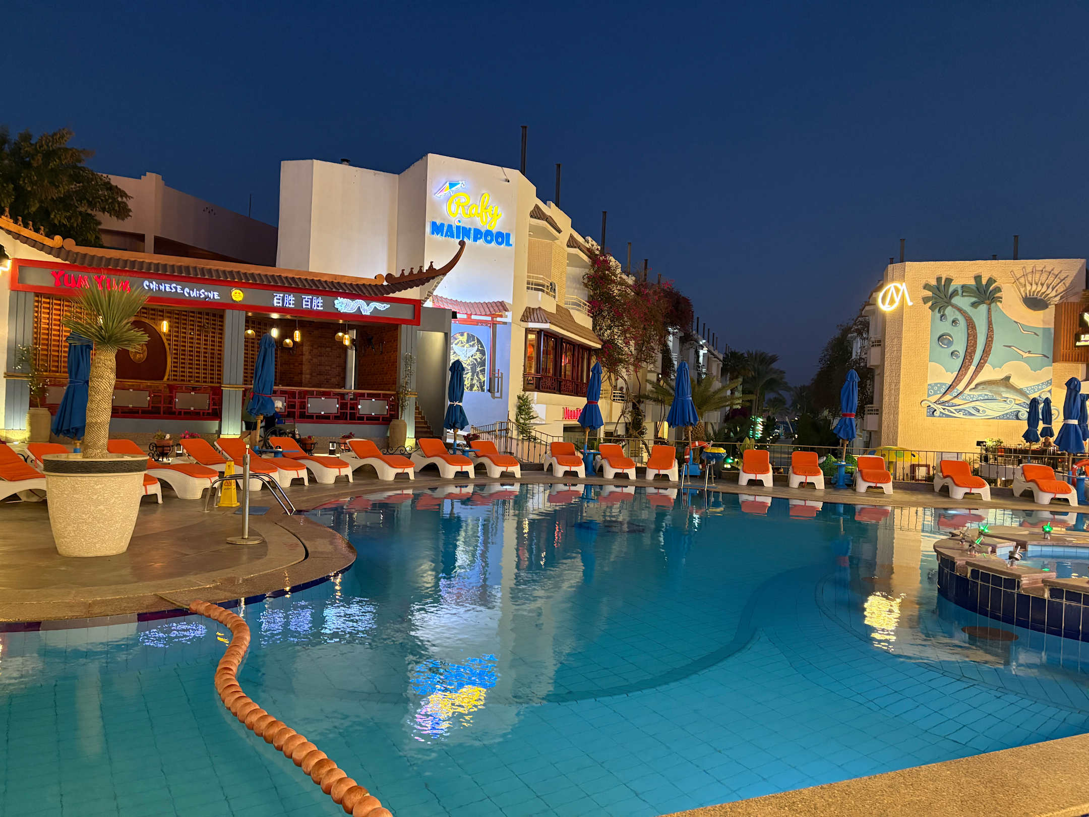 Blick von der Sonnenterasse auf den Pool und auf den Weg zum Strand 🫶