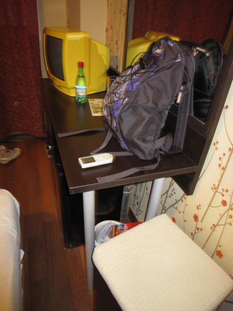 Fernseher und Durchgang Großbildfernseher und Durchgang zwischen Bett und Kommode, Kühlschrank steht darunter, leider kühlt er nicht