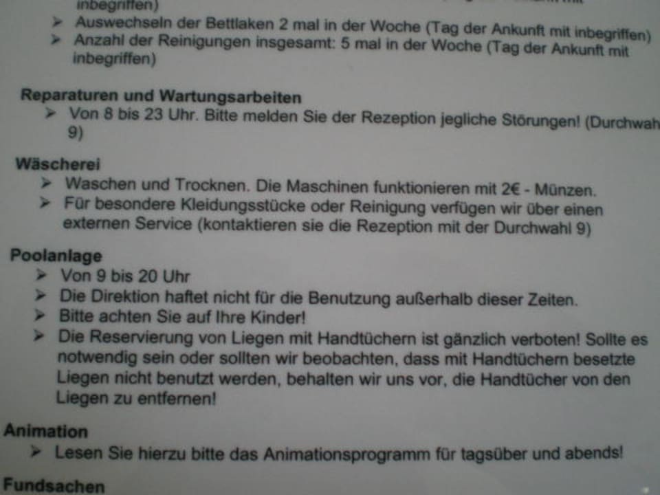 Hier wurde aufgeführt, das den Gästen ein Waschraum-und Trockenraum zur Verfügung stehen sollte.....NIX DA. Man hatte wohl vergessen, diesen Punkt im Katalog und im Hotel abzuändern.
