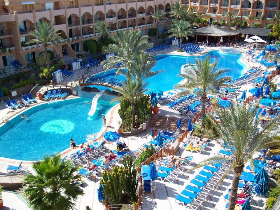 Blick auf den Pool vom Block A, Zi 408links im Bild der Block D, hinten rechts Block C mit Poolbar im Vordergrund.