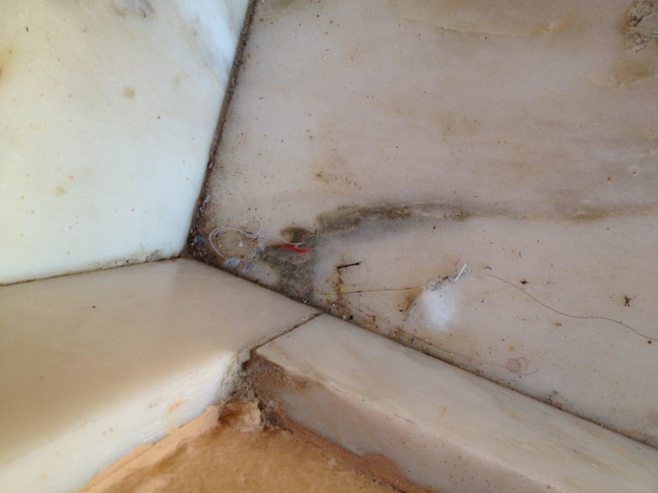 Balkon mit vielen Taubenfedern und Dreck