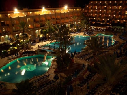 Blick auf den Pool bei Nacht vom Block A aus