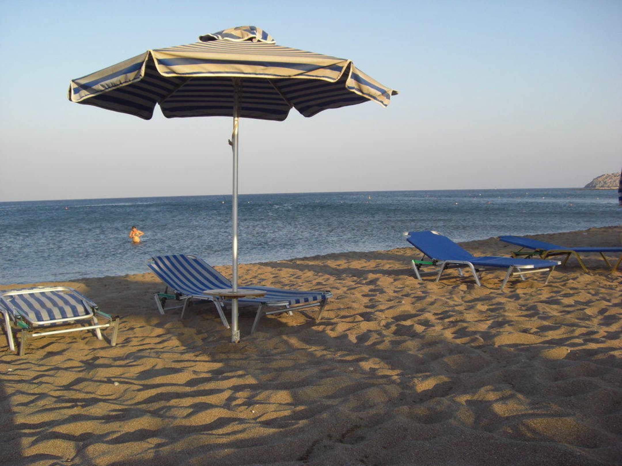 Auf dem Bild befindet sich ein Ausschnitt vom Strand mit Liegen und Sonnenschirm