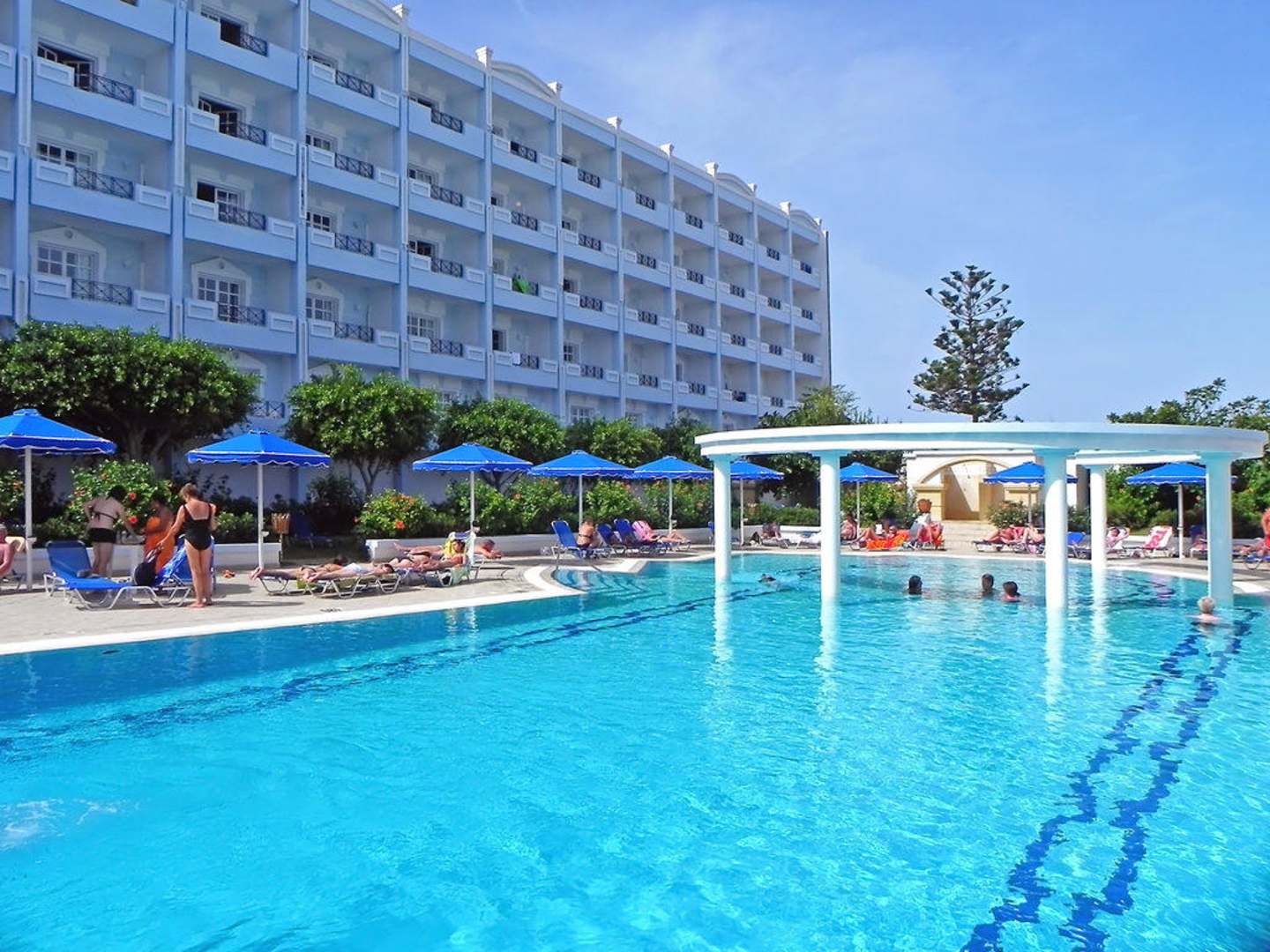 Pool-Anlage auf der Meer-Seite vom Hotel Mitsis Grand.