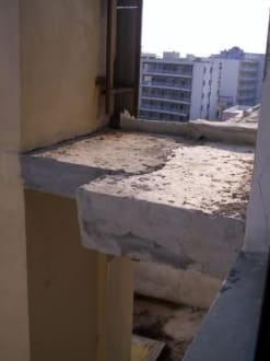 Blick vom Treppenhaus im 7.OG auf baufällige Gebäudeteile. So sehen alle Hotels in der Umgebung bei näherem Hinsehen aus. Schuld ist z.T. die agressive Seeluft