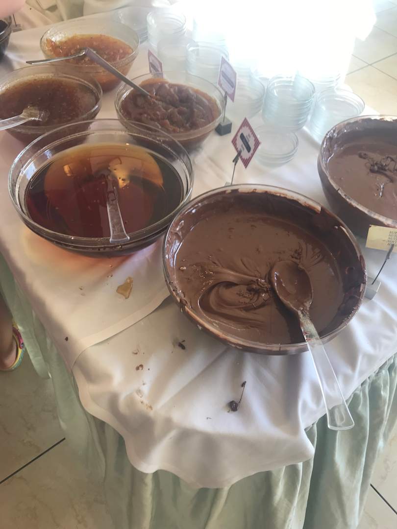 GastroMarmelade, Honig und Nuss-Nougatcreme in Suppenschüsseln, alles total verschmiert.