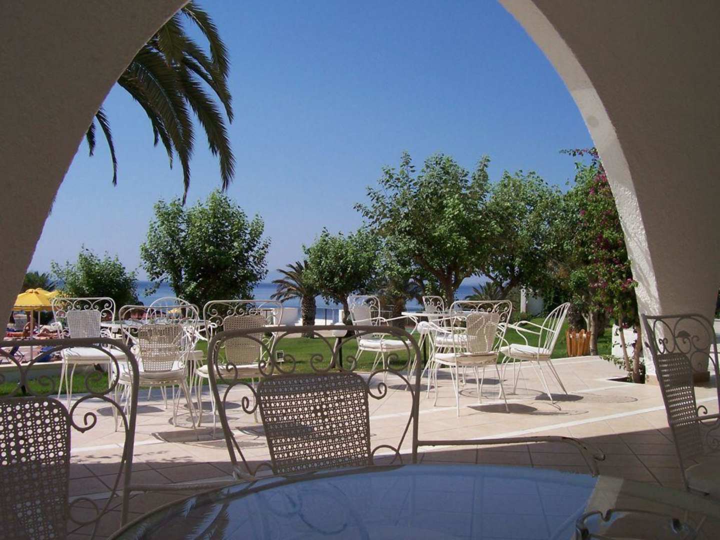 Blick vom Barbereich auf Pool und Strand