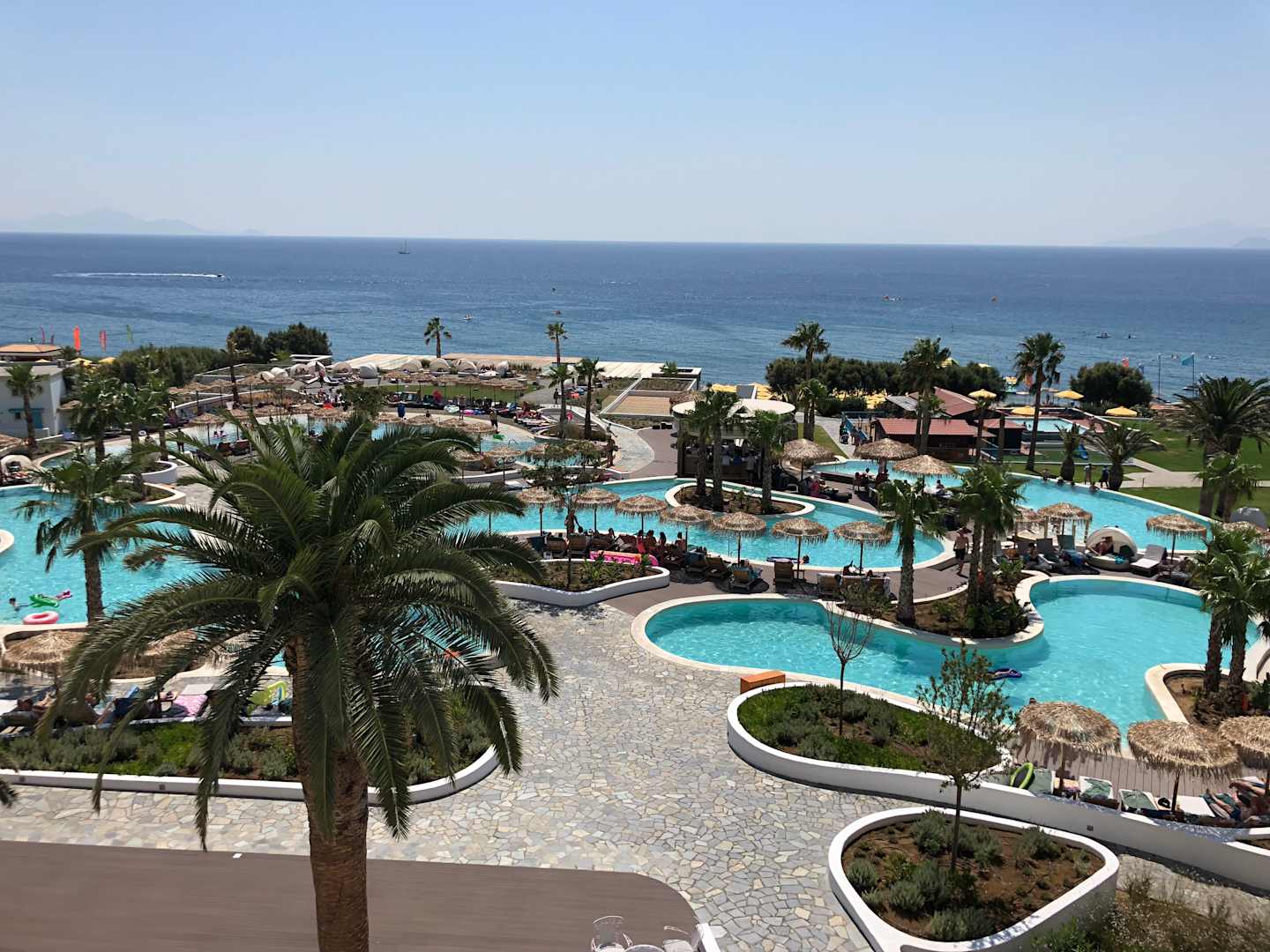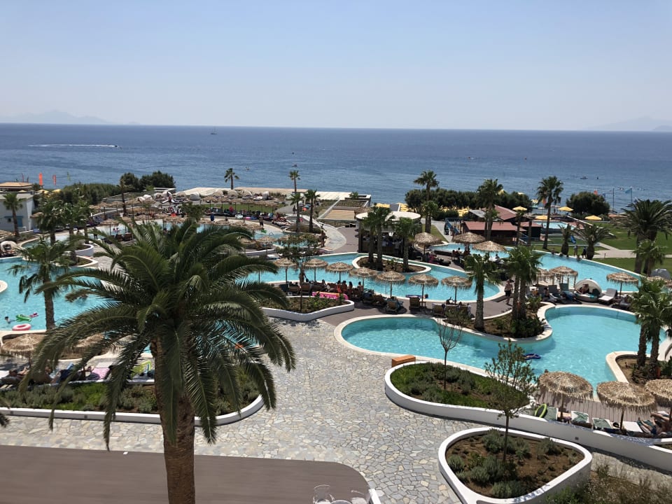 Ausblick vom Hauptgebäude auf Pool und Meer