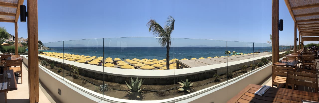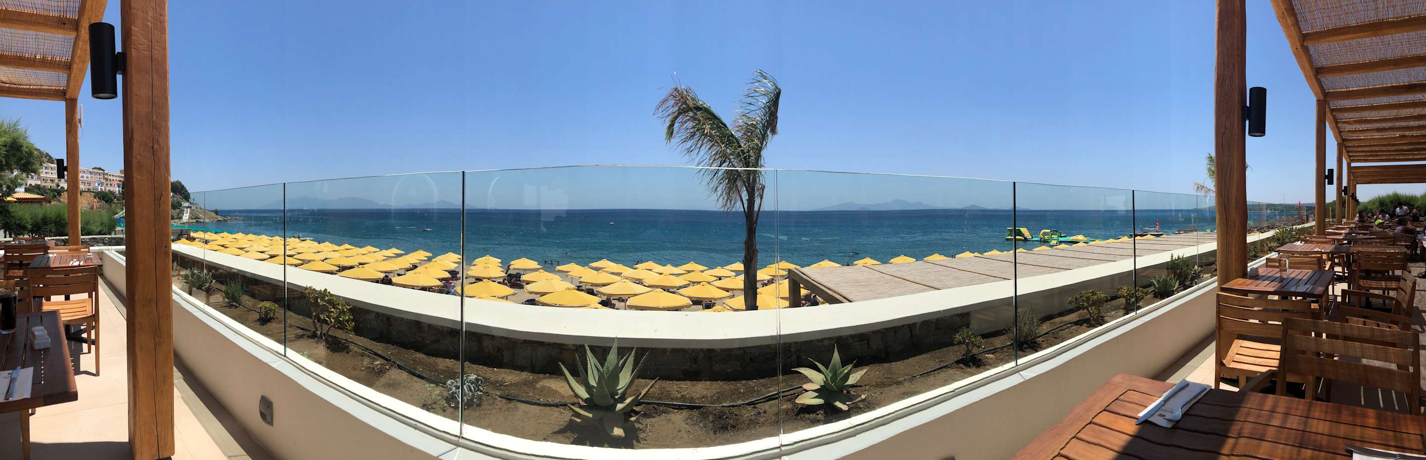 Ausblick aus Strandrestaurant mit Blick auf das Meer. Links Türkei