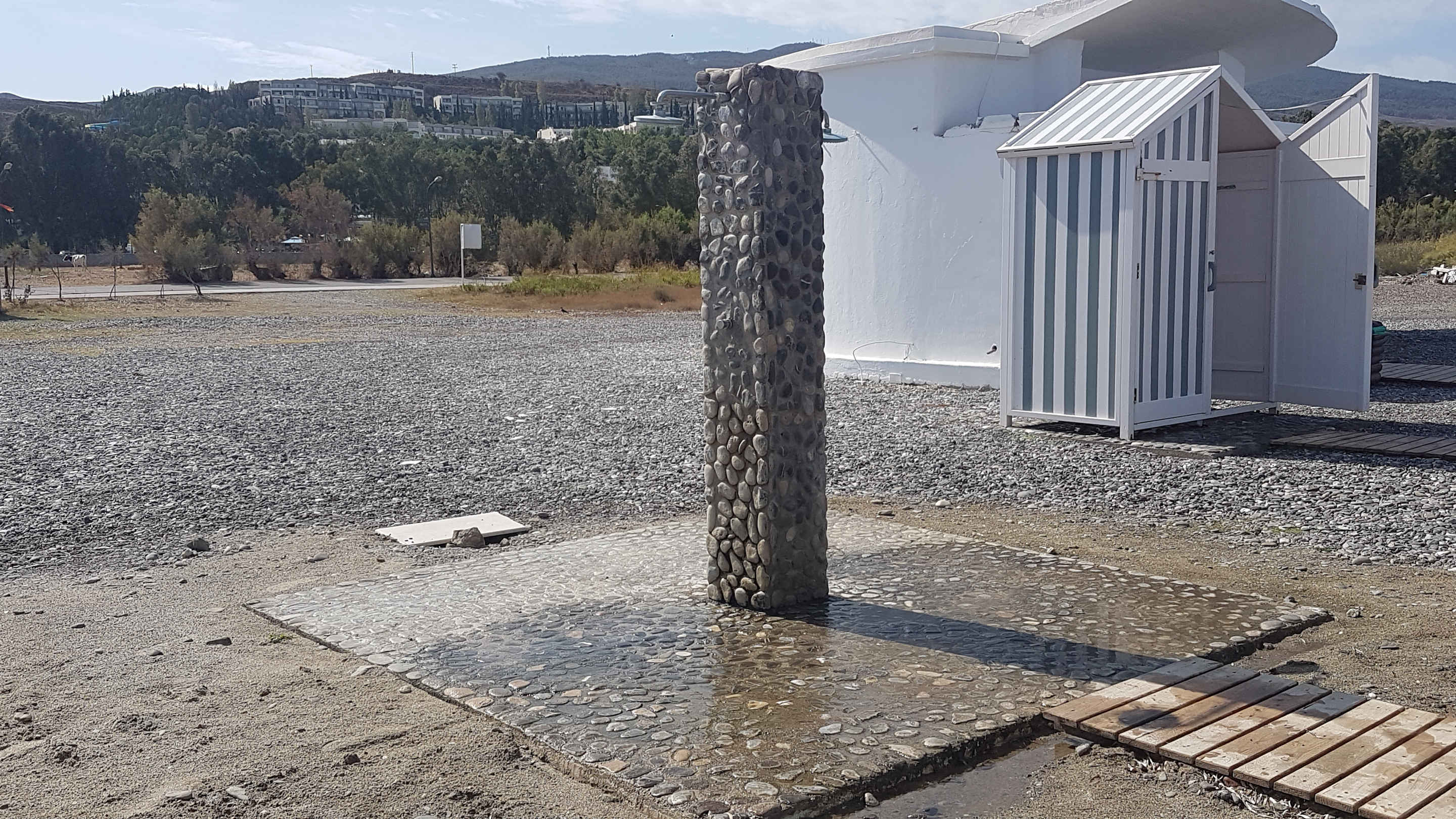 Die Freiluftdusche am Strand mit einer der Umkleidekabinen