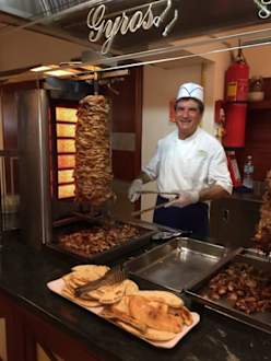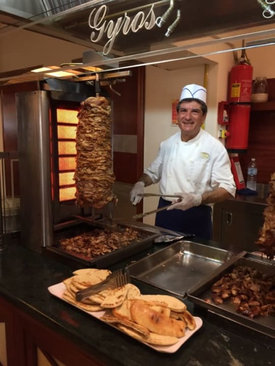 Gyros gab es jeden Tag . Und der nette Koch er lacht.