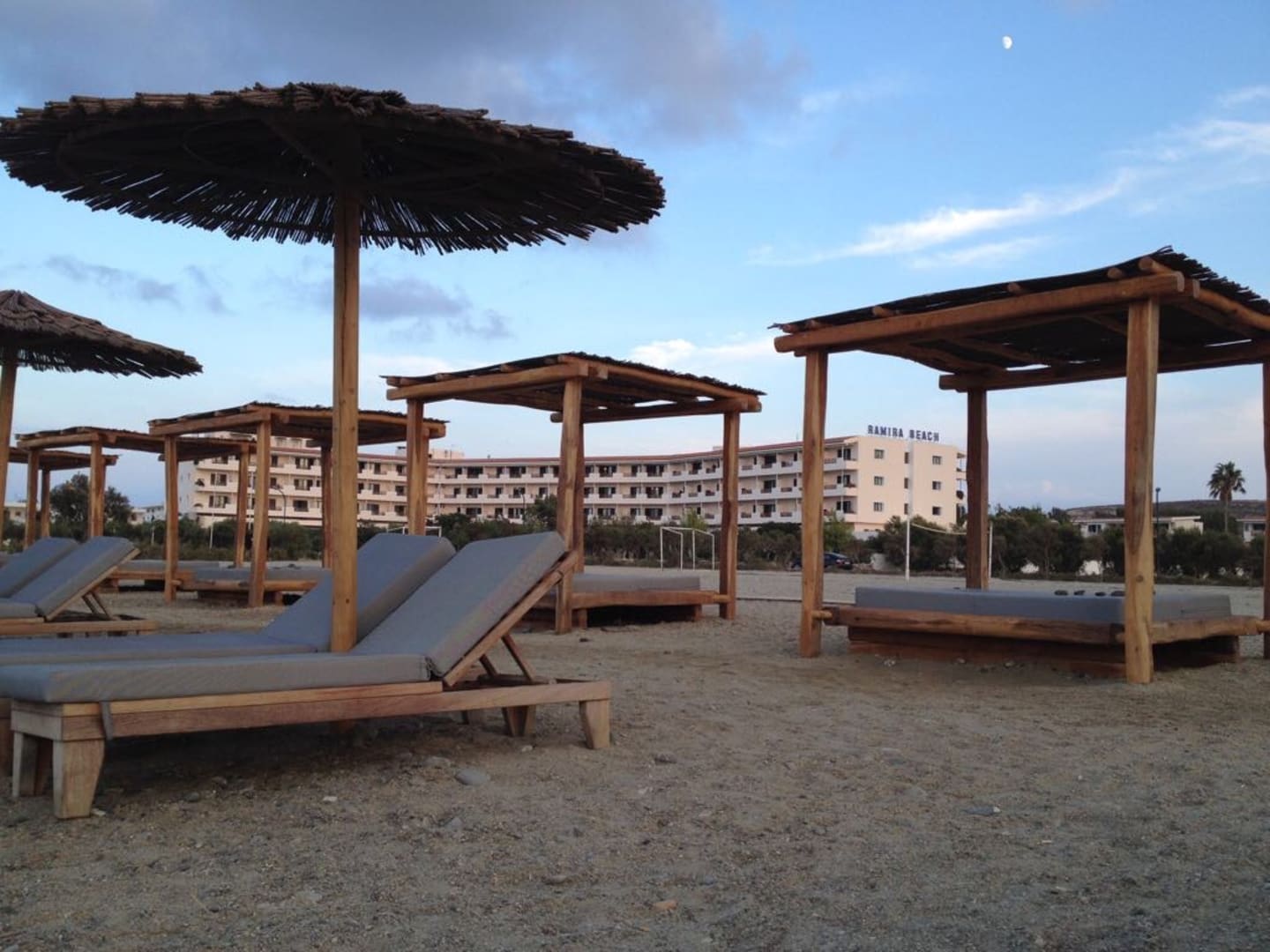 Strandbetten und Liegen im Hintergrund das Hotel