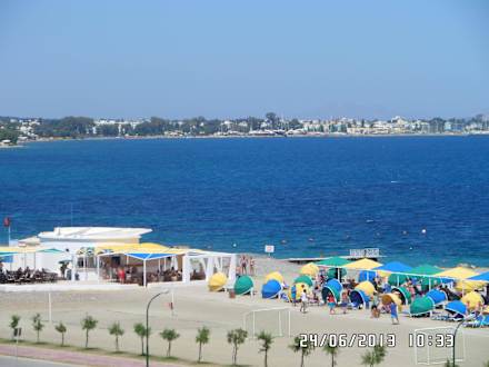 Výhled z balkonu pokoje na pláž a hl. město Kos