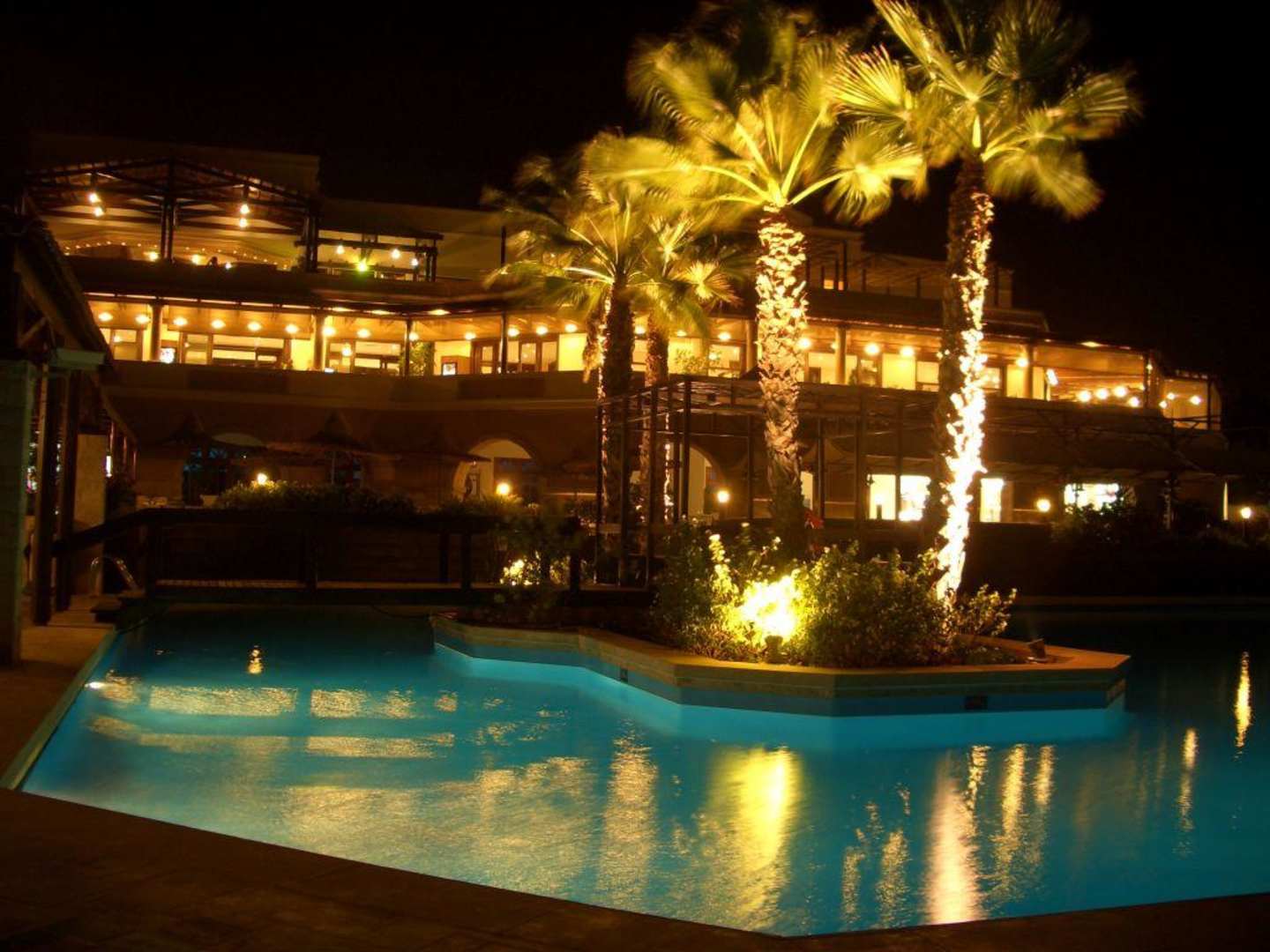 Blick von einen der Pools auf die Terasse des Hauptrestaurants