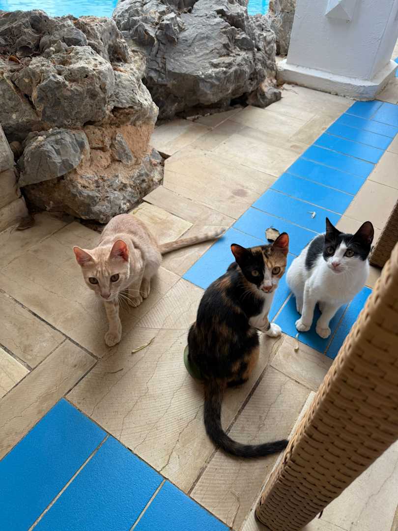 Einige der vielen Katzen auf der Hotelanlage. Das Hotel hat verschiedene Futterplätze für die Türe und schaut dass diese immer etwas zu Essen und Trinken haben.