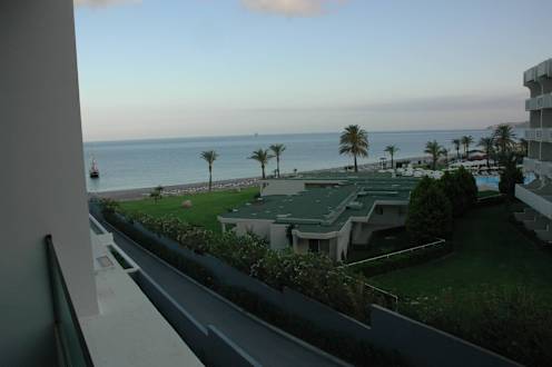 Boczny widok na morze i sąsiedni hotel
