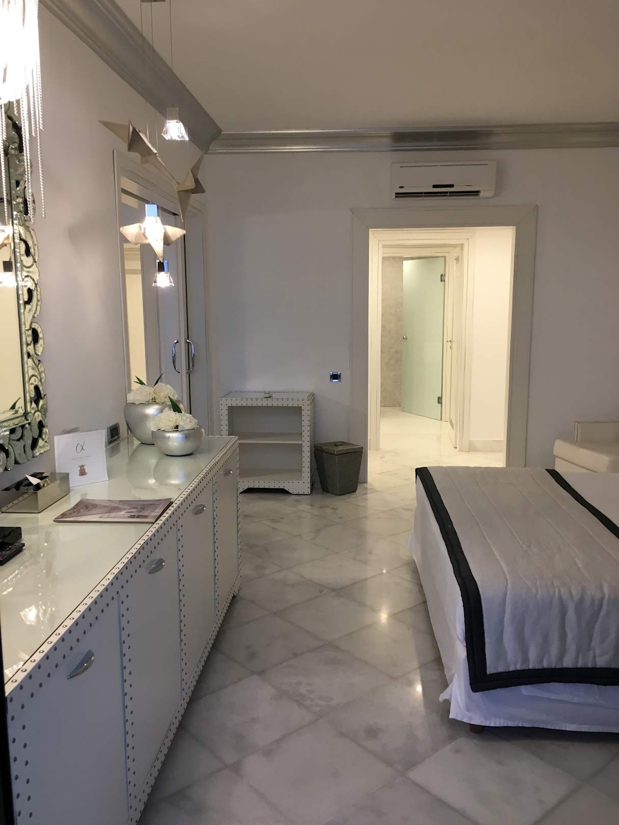 Schlafzimmer der Präsidenten-Suite mit King-Size-Bett und Blick ins Ankleidezimmer. Danach folgt das zweite Badezimmer mit Badewanne und dahinter kommt die abgetrennte Dusche und WC.