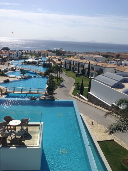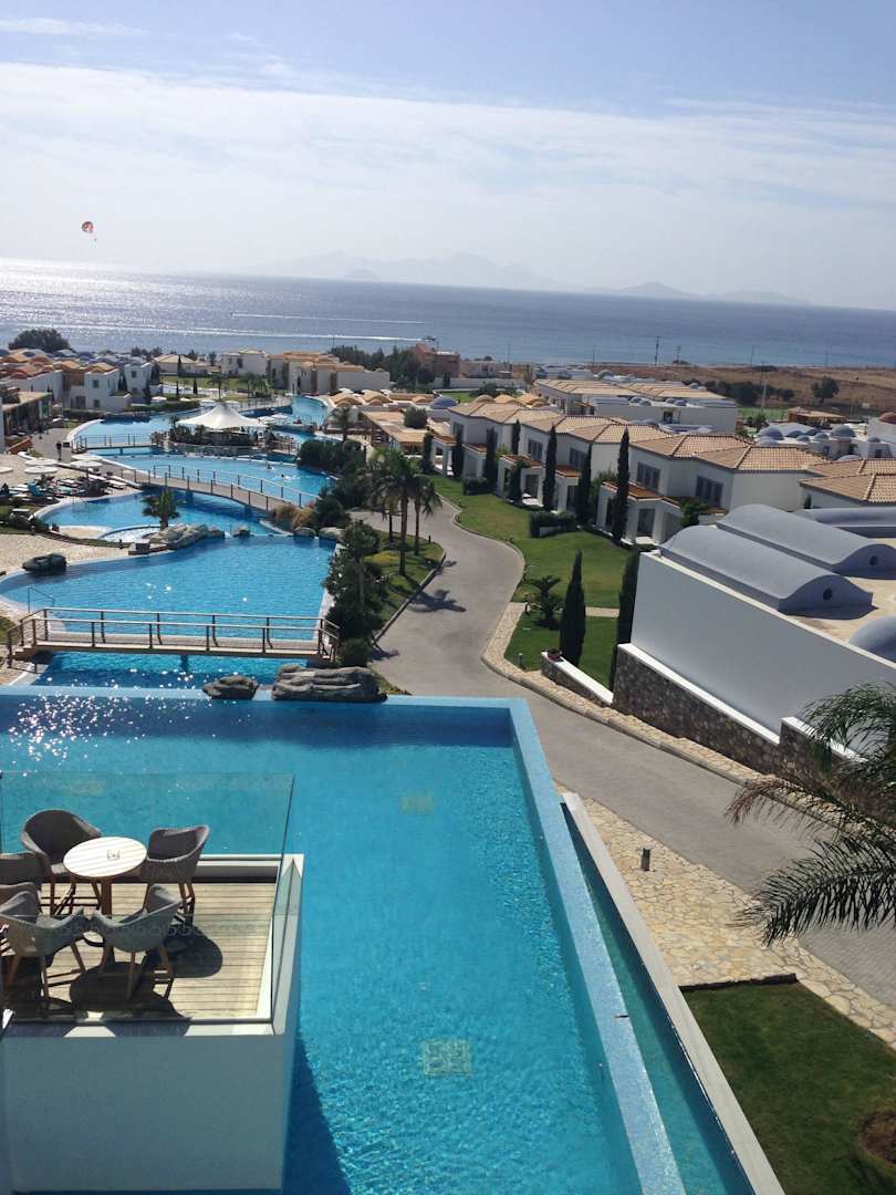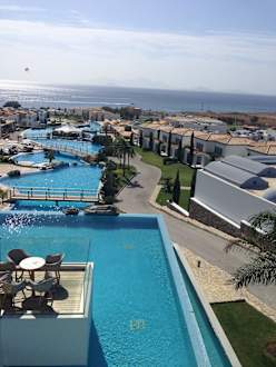 Widok z głównego budynku na baseny oraz Morze