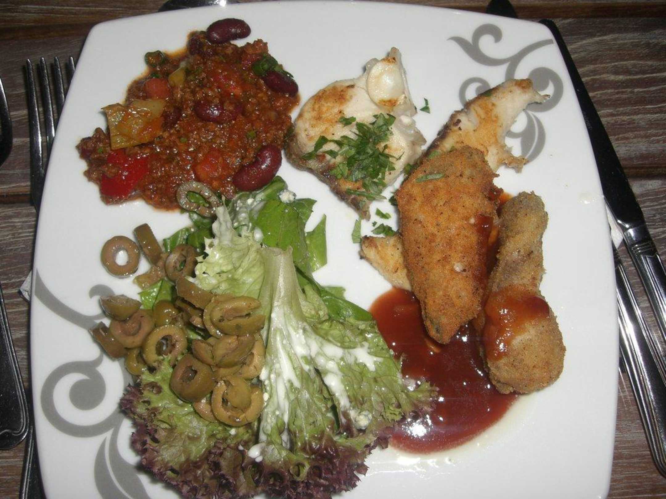 BüffetauswahlHünchenteile mit Barbecuesauce, Chili con Carne, Fisch vom Grill, Salat mit marinierten Oliven