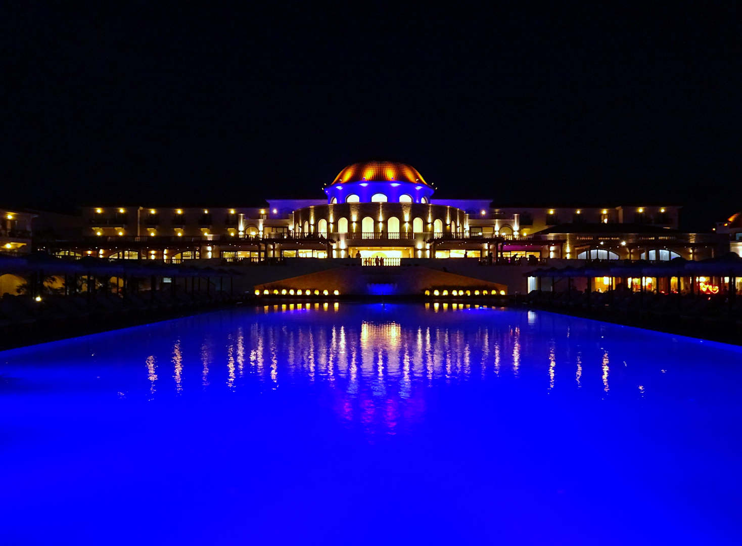 Blick über den Hauptpool zum Gebäude bei Dunkelheit