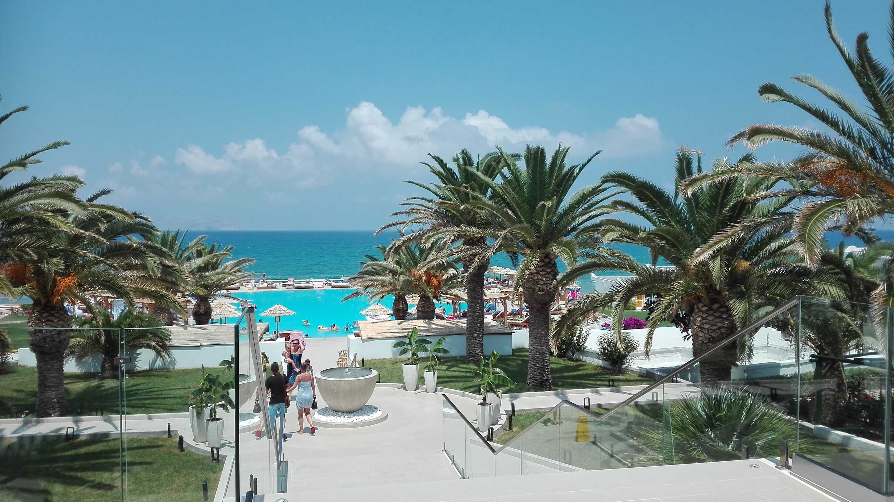 Aussicht von der oberen Terrasse (Rezeption, Eingang Hauptbereich) auf Pool und Strand/Meer