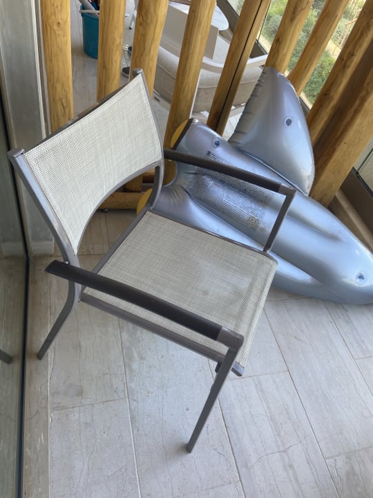 Das war der Stuhl den die uns nachdem ich mich beschwert habe das der ursprüngliche Stuhl scharfkantig für Kinder ist auf dem Balkon gestellt haben noch gefährlicher da er sogar ganz leicht kippen kann.