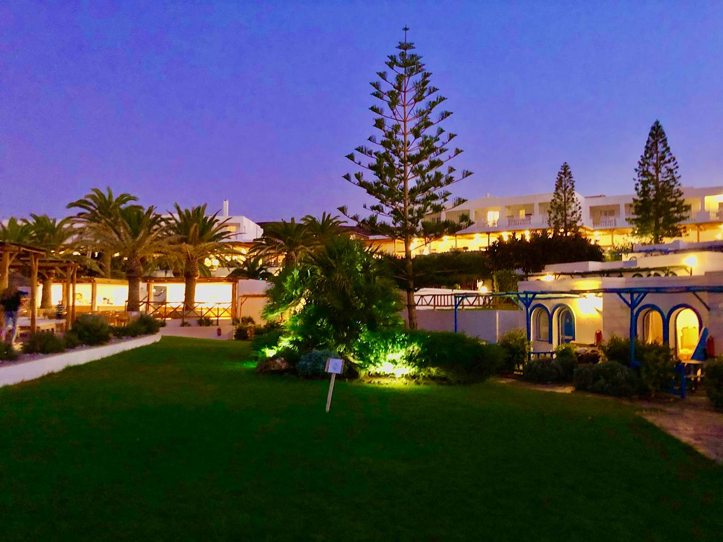 Hauptgebäude (hinten) und Bungalows am Abend