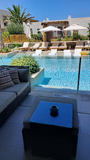 Unsere Terrasse mit Poolzugang und den Liegen auf der gegenüberliegenden Seite. Wir hatten Zimmer 207.